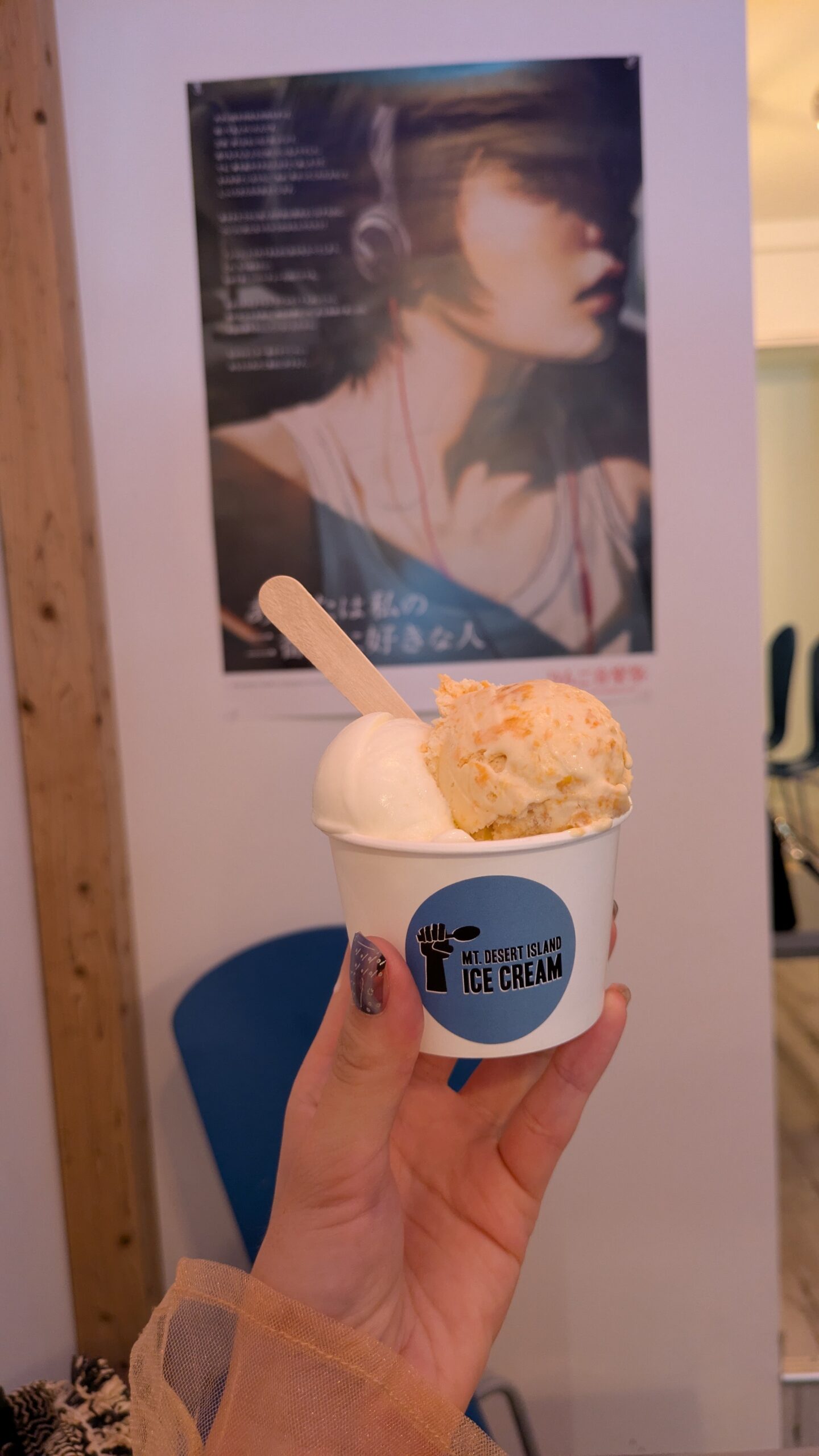 暑いので、縄手通りのマウントデザートアイランドアイスクリームでダブルのアイスを注文。フレーバーはバターミントと千曲アプリコット。りんごのポスターを貼ってくれている。