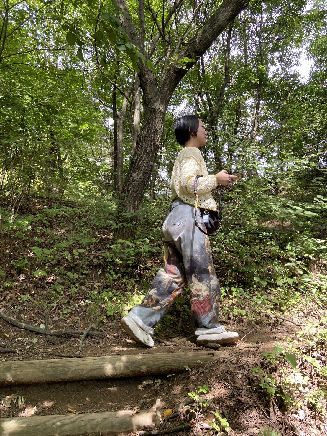 まず1年目、2022年。コロナがようやく落ち着いた頃。私にとっては初めてのフェス・初めてのりんご音楽祭でした。ロンT、羽織用の中華シャツ(日中は暑かったので腰に巻いていました)、無印の黒スキニー、GUの厚底黒スニーカーにナイロンのサコッシュ。「フェスって、なんか、こんな感じ!?動きやすい方が良いんだよね!?汚れるの怖いし・・・」という出で立ち。