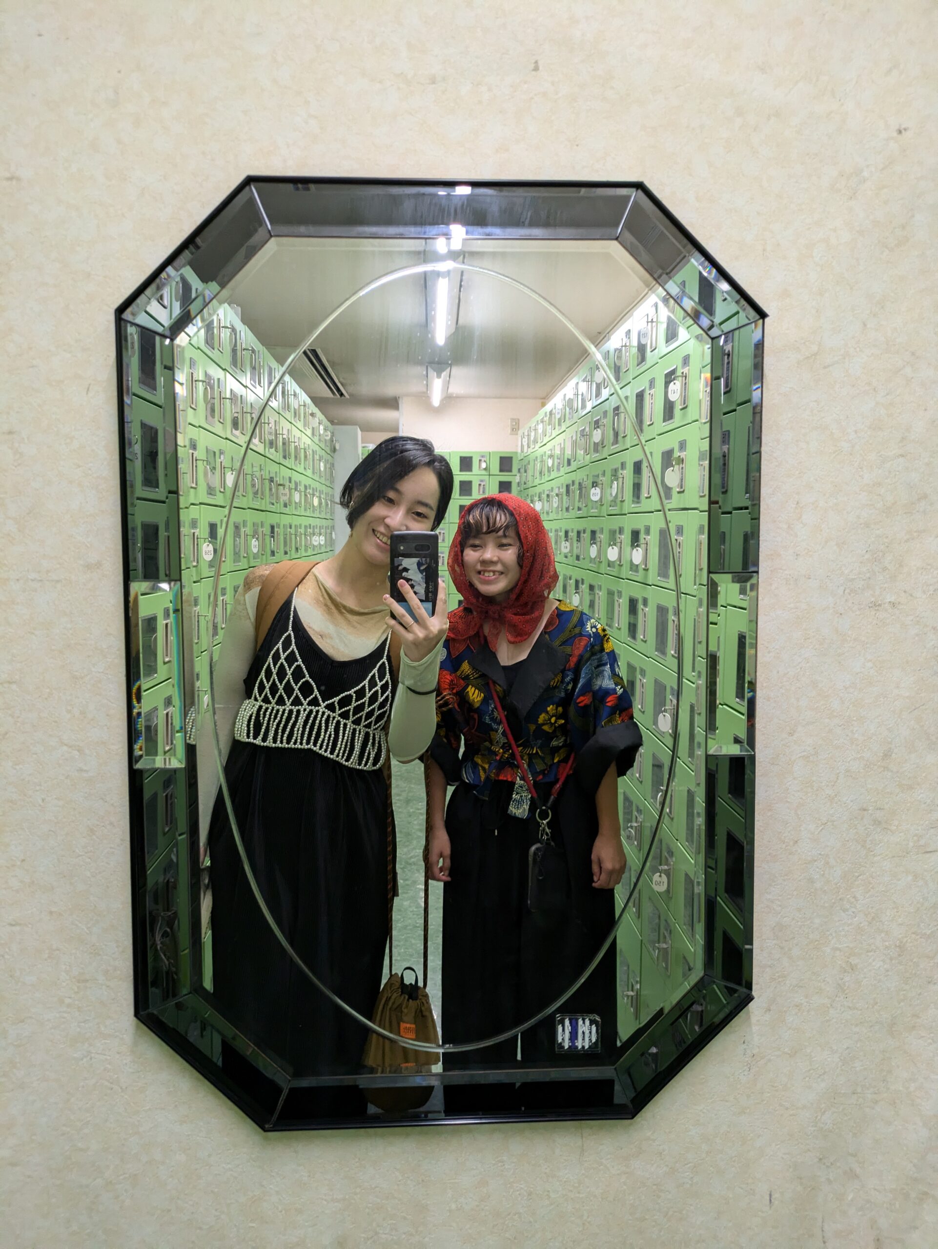 初日は長袖のシースルートップス、黒のオールインワン、パールビスチェ、足下は革素材のシルバーのスニーカー。防水素材のポシェット。2日目は同じく長袖のシースルートップス、フレアパンツ、レースのキャミワンピ。目元にパールのシールを貼りました。